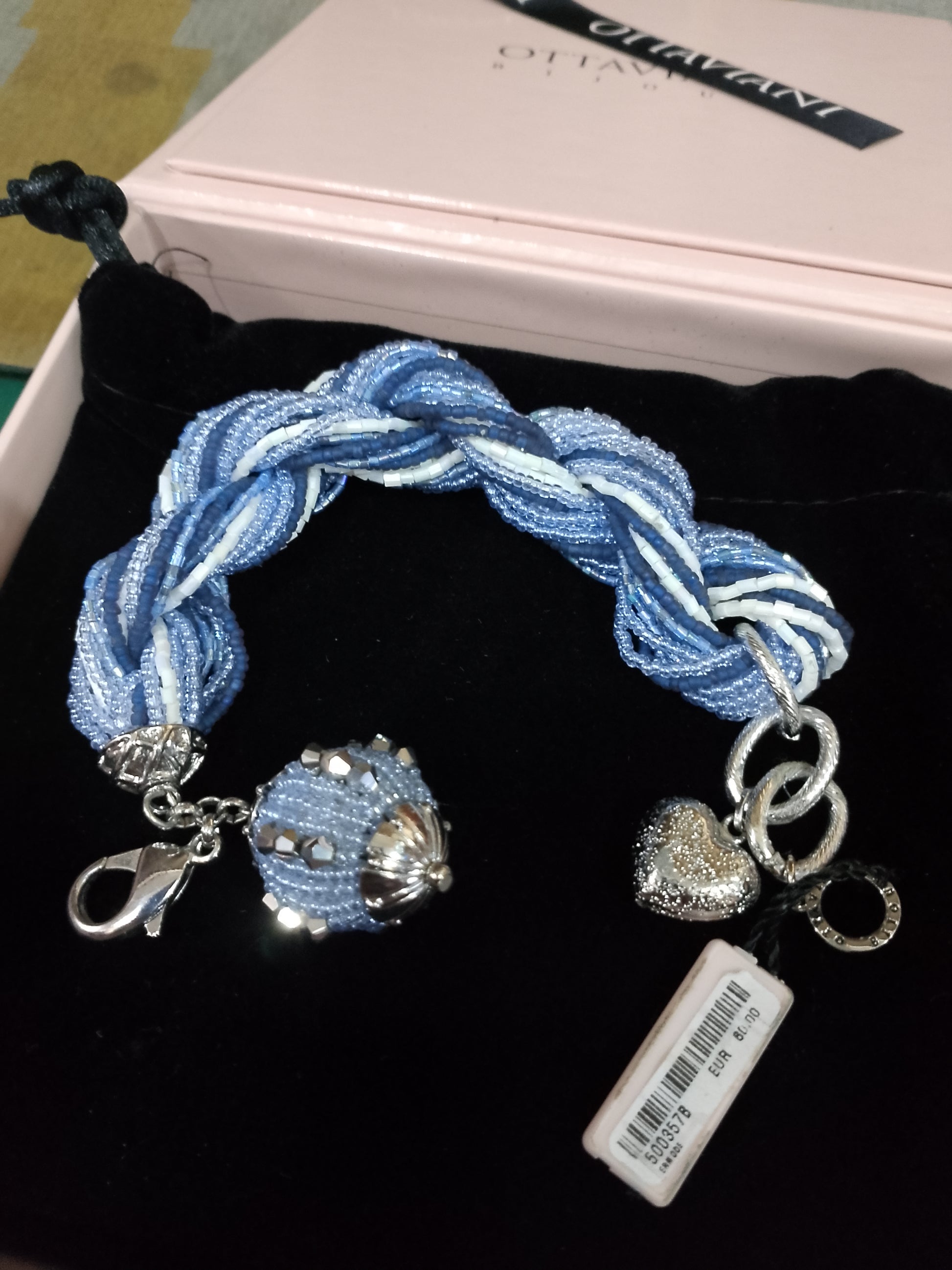 Metallo . argentato con perline e cristalli di colore blu e bianco.